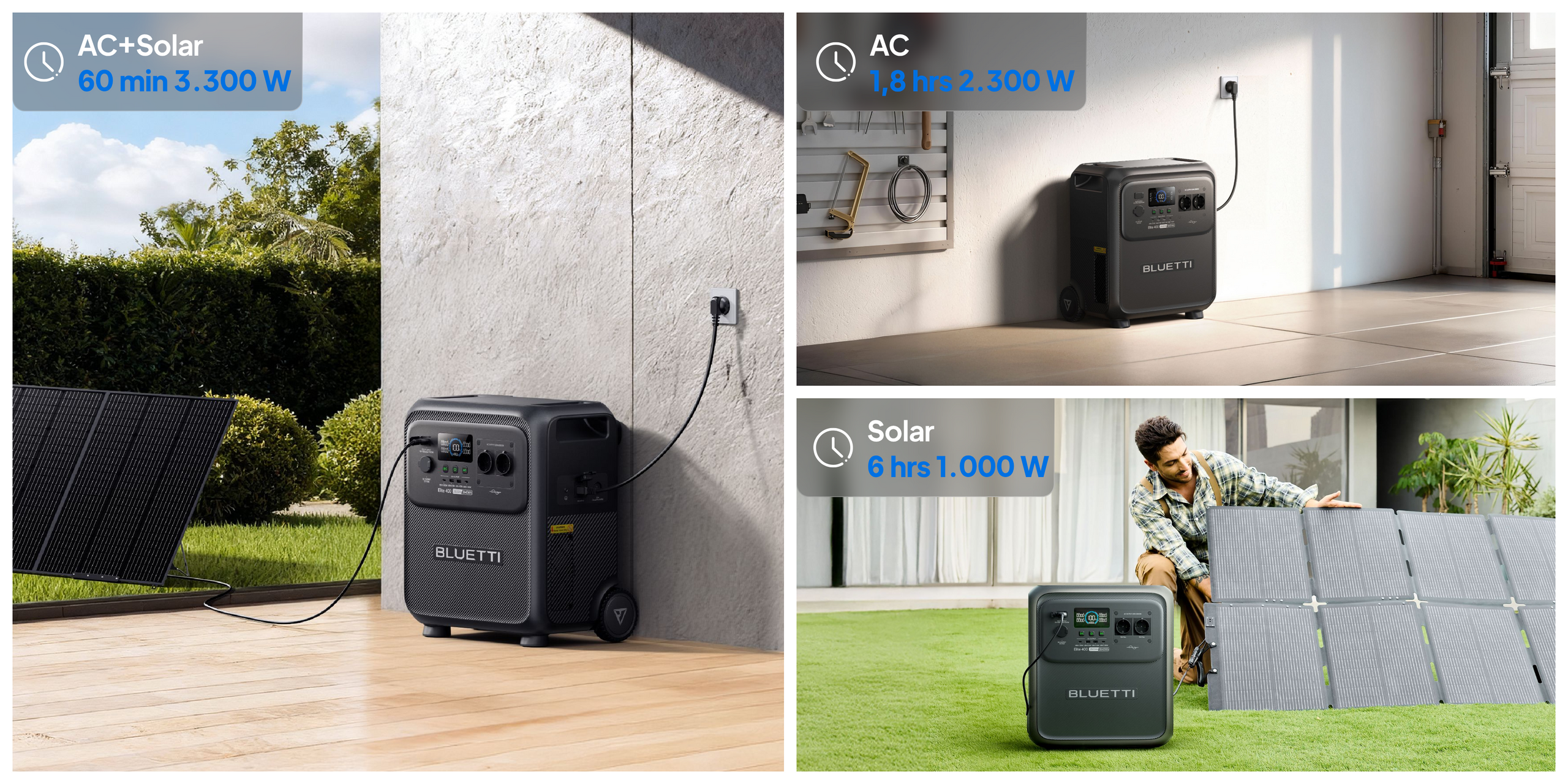 ● 3.300 W AC + Solar: 0-80 % en 60 minutos, carga completa en 1,5 horas