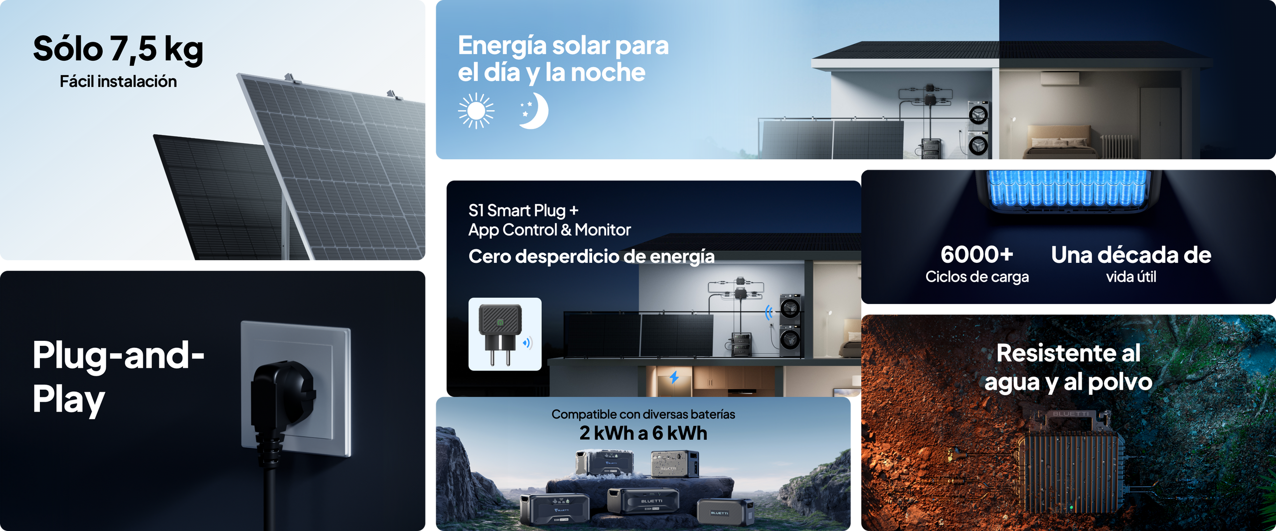 El sistema solar para balcones BLUETTI es un sistema de almacenamiento de energía conectado a la red eléctrica de alta eficiencia. Puede captar energía solar durante el día para alimentar los elementos esenciales de tu hogar y almacenar energía adicional para alimentar durante la noche, lo que te ayuda a ahorrar en las facturas de electricidad y a prepararte para apagones inesperados. -