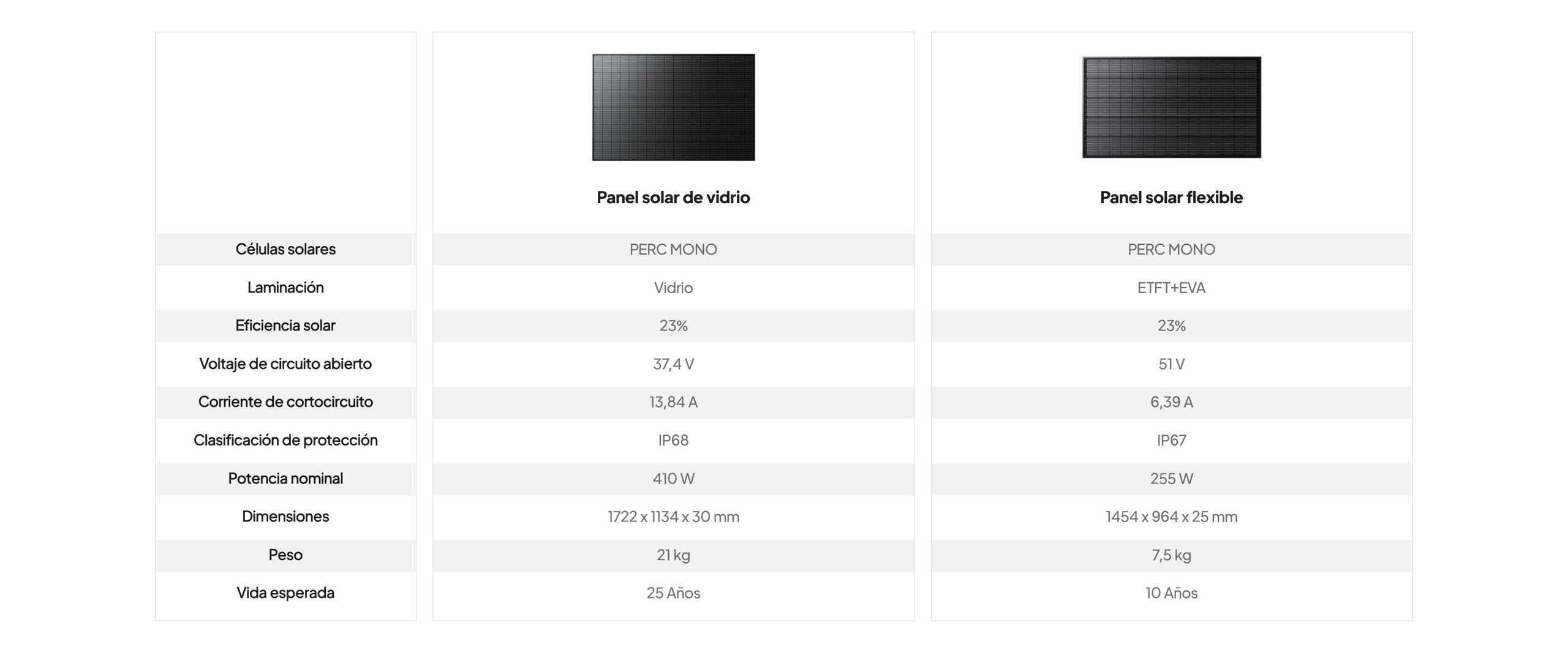 El panel solar flexible es más liviano, pero tiene una potencia de entrada menor que el panel solar de vidrio. Sin embargo, el panel solar flexible tiene una clasificación IP67, mientras que el panel solar de vidrio tiene una clasificación IP68 para resistir el agua y el polvo, y puede soportar vientos fuertes. Consulta las especificaciones para conocer la mejor opción adecuada para ti.