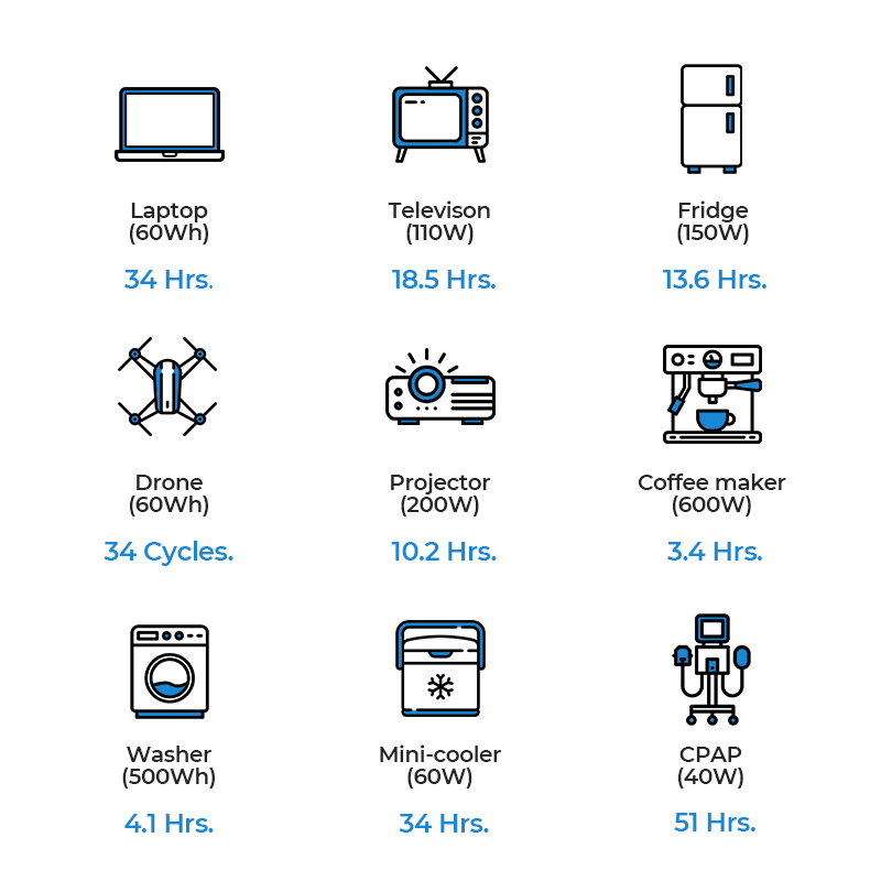 2400Wh*0.85/Potencia del dispositivo = duración de uso (Hrs)