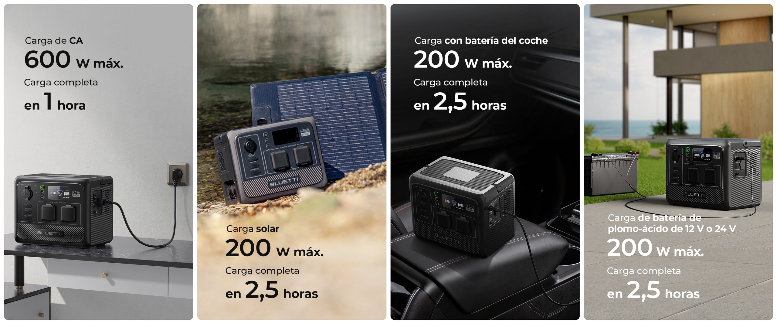 R:El AC60 admite una entrada de potencia máxima de 600 W. Conéctalo a una toma de pared, activa el modo de carga Turbo en la aplicación BLUETTI y puedes cargarlo en 1,2-1,7 horas.