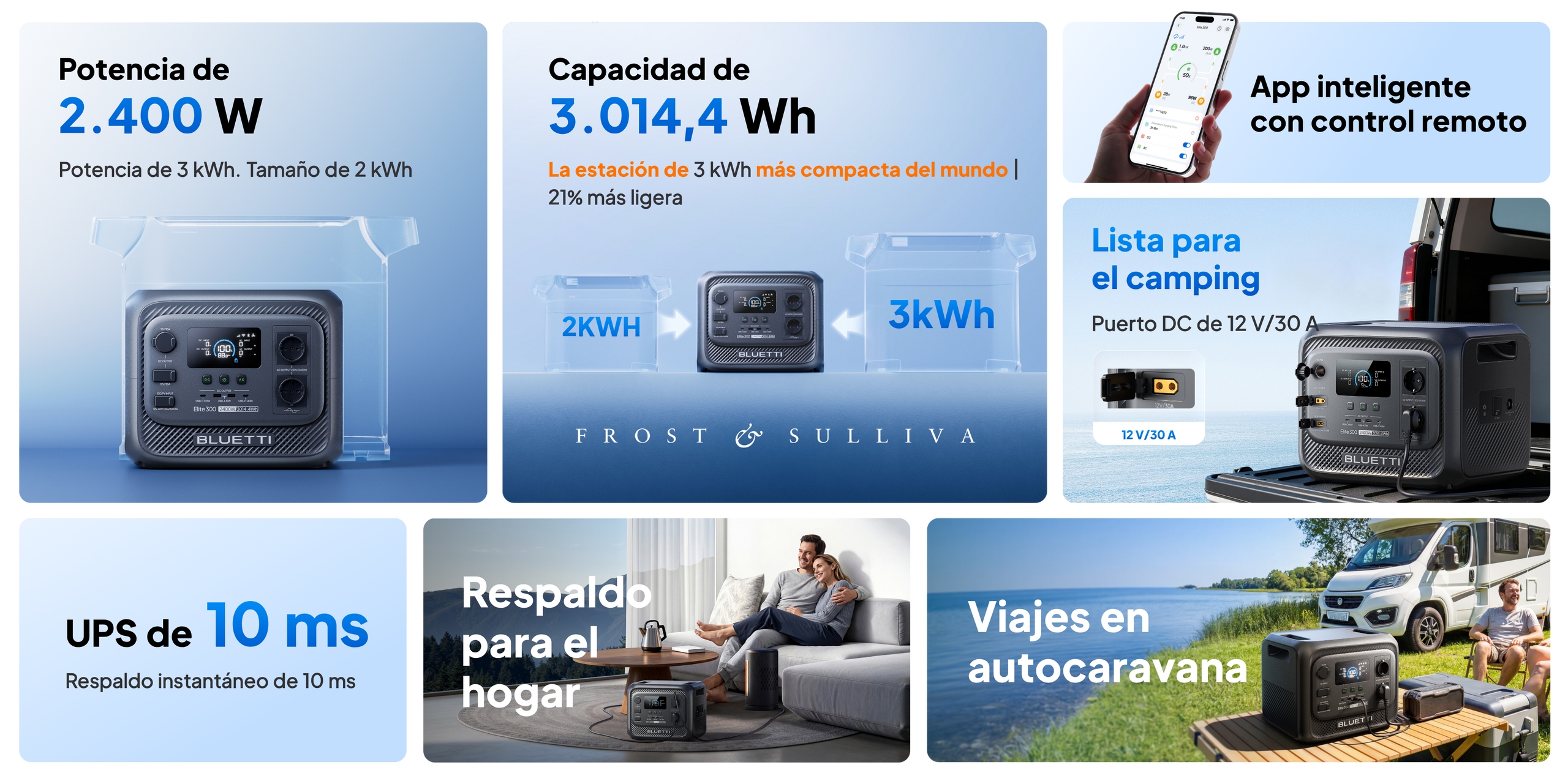 El Elite 300 es una potente estación de energía portátil con 3.014,4 Wh y 2.400 W. Es ideal para respaldo en casa, viajes en RV, actividades al aire libre y emergencias. -