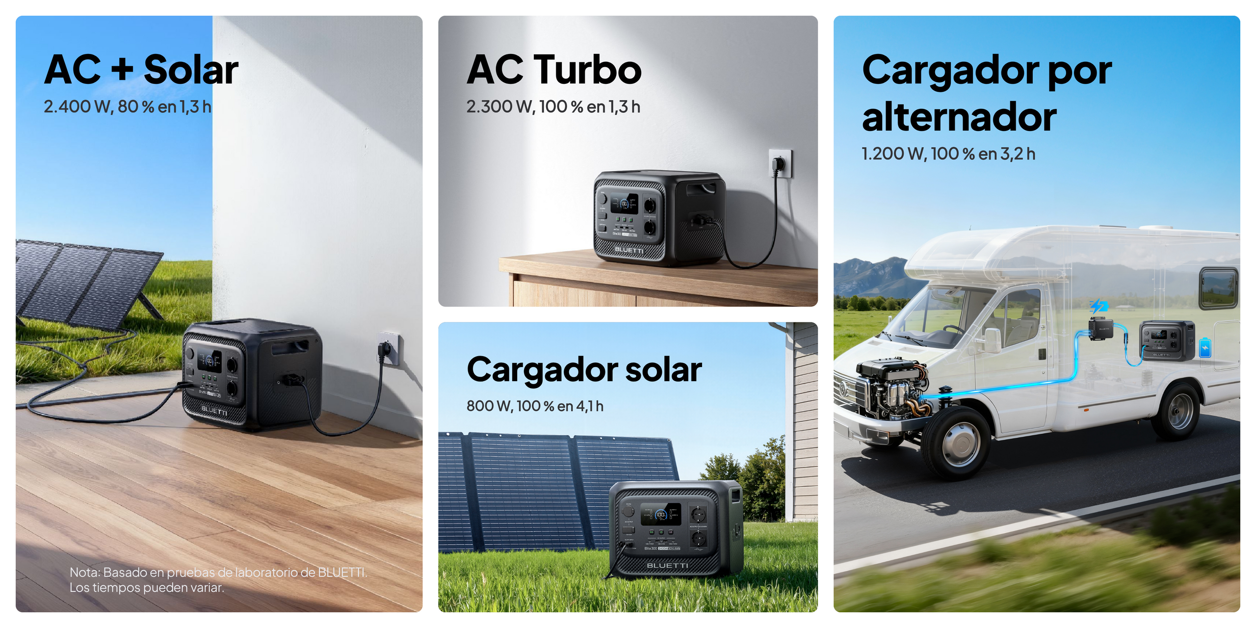 ● AC + Solar 2.400 W: 80 % en 78 min, 100 % en 1,6 h